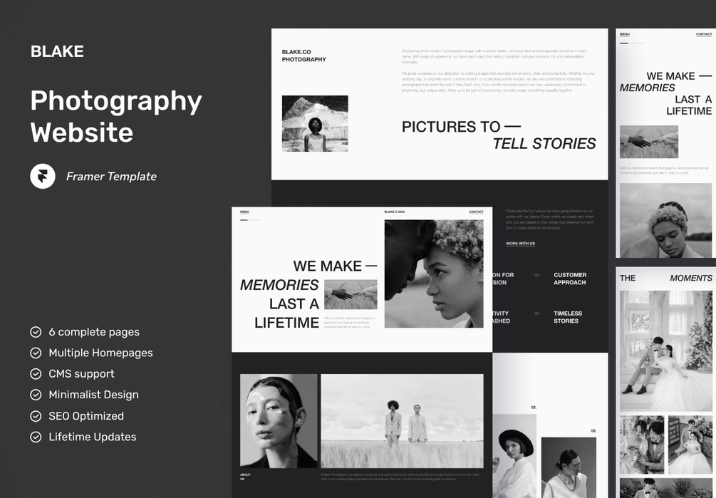 Captive your audience with the incredible and outstanding website design using Blake, a minimalist and modern photography website Framer template. With a well-organized layout, you can have a beautiful website look.
