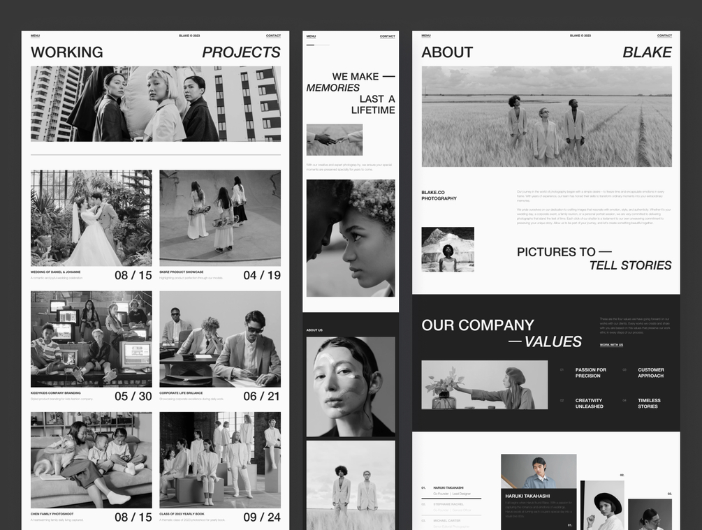 Captive your audience with the incredible and outstanding website design using Blake, a minimalist and modern photography website Framer template. With a well-organized layout, you can have a beautiful website look. Besides, it also helps users to explore your website easily and comfortably. Although it seems grayscale and black and white, but the images in every page can turn colorful when you highlight the image. Use this template for your photography service website and transform it into a better and more professional one.