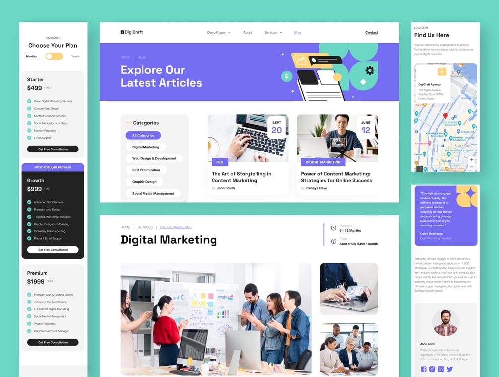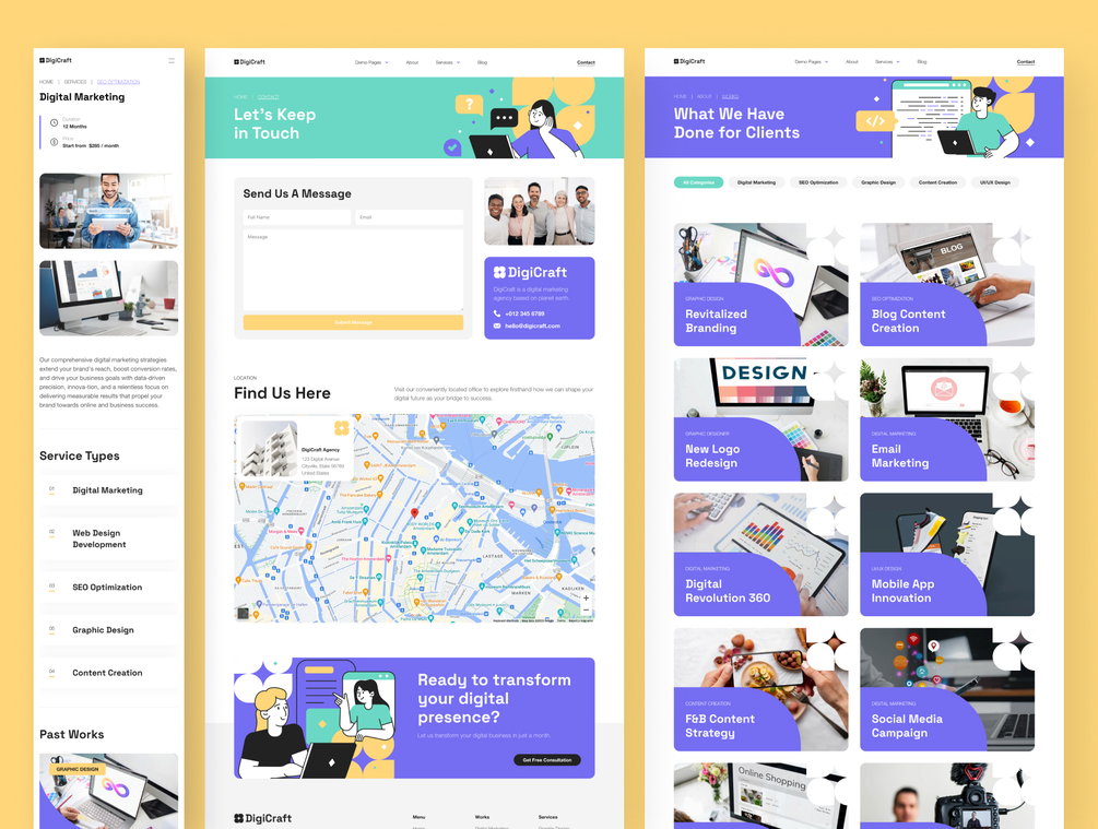 Show the creativity of your agency using DigiCraft, a creative and bright digital agency website Framer template.