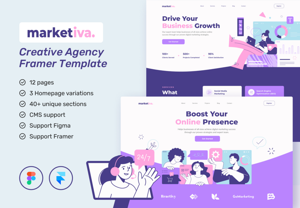 Many businesses are increasingly aware of the need for assistance from marketing agencies to be competitive, especially with so many new businesses popping up. It can be an opportunity and a challenge for a marketing agency like yours. You can cultivate their trust in your agency, starting by polishing your company website. Marketiva, a digital marketing agency website template, is what you need to make people entrust their businesses to your hands.